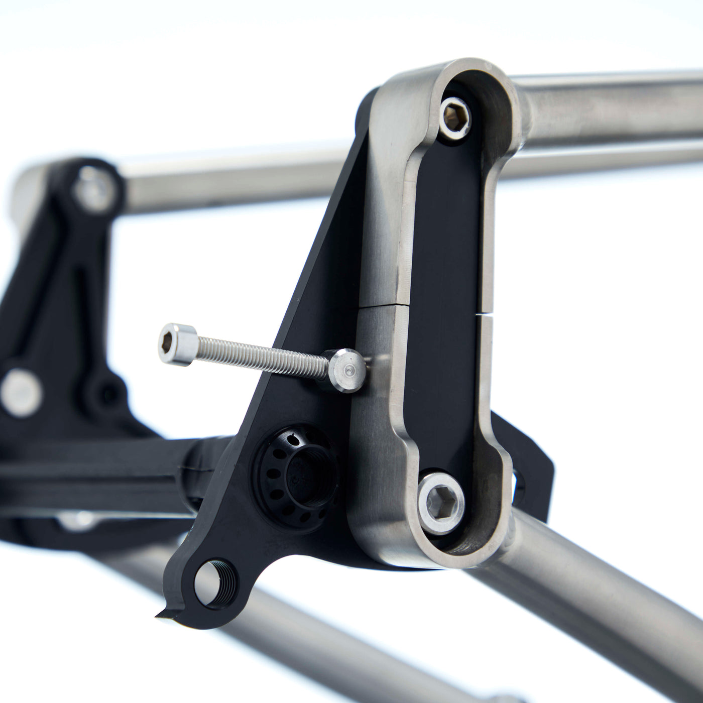 The RocknRollout Dropout is at the heart of the OLSEN frame design. We have focused our design around the rear derailleur dropout, but taken it further. Most bicycle frames have replaceable dropouts, but they do not allow for anything other than a derailleur. This idea came from the fact that UK riders often have a winter bike, which is often single-speed.